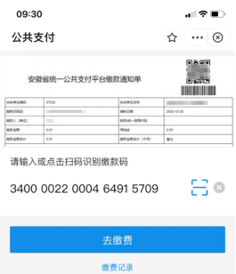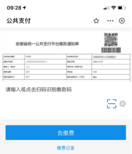 缴款人打开微信客户端,扫码(见附件2)进入安徽省统一公共支付平台小程序,输入缴款识别码办理缴款。