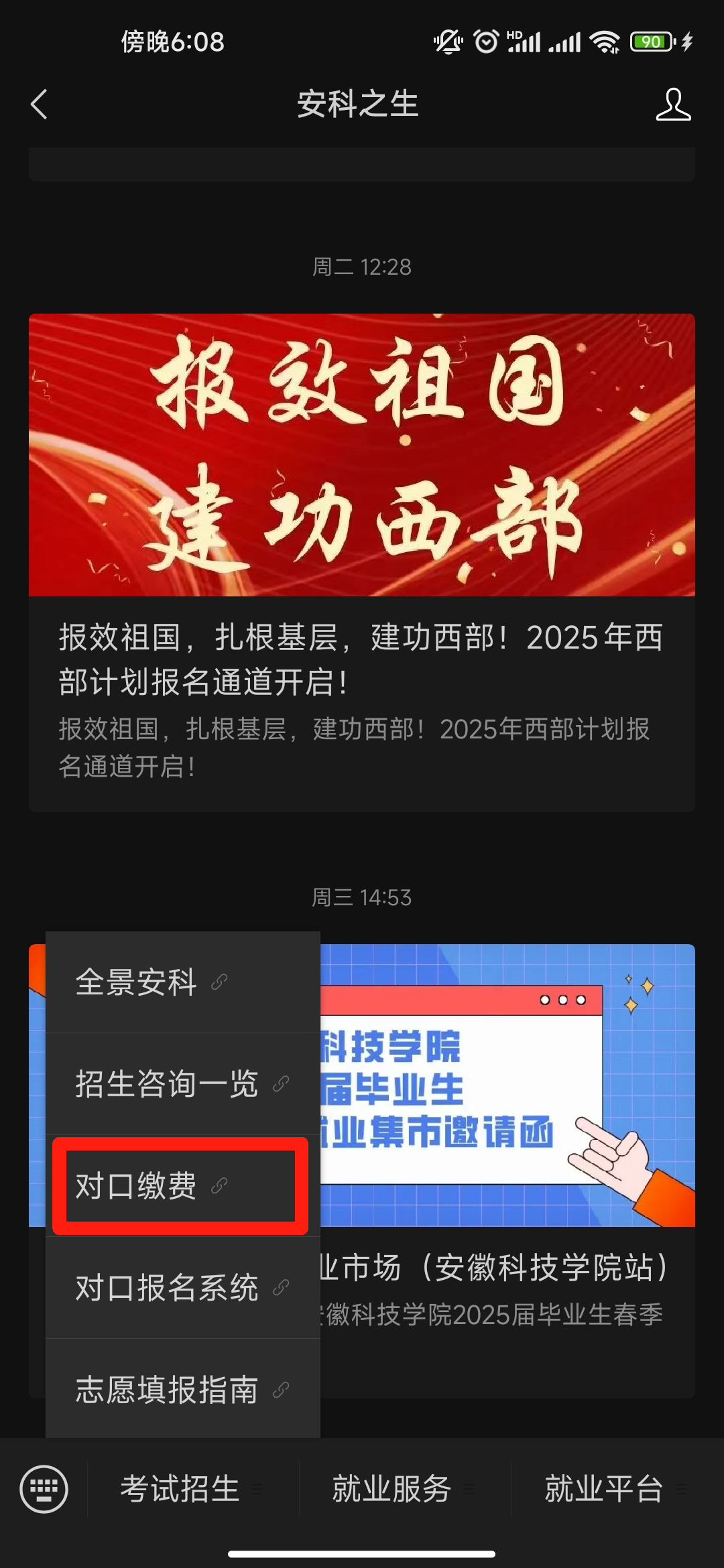 根据《安徽科技学院2025年面向中职毕业生对口招生章程》,报考我校的考生,报名资格审核通过且文化课考试成绩达到200分(免试面试考生要达到省定控制线),方可缴费。未达到200分,不安排缴费,不安排考试。请广大考生扫描下方二维码关注安徽科技学院招生办公室官方微信公众号“安科之生”。于3月17日12:00前进行缴费。