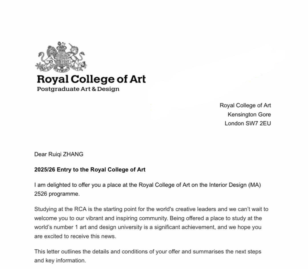 特别祝贺2025届艺术设计学院学子 张芮绮同学,斩获皇家艺术学院(艺术与设计QS:1)、悉尼大学(QS:18)、爱丁堡大学(QS:27)、格拉斯哥艺术学院(艺术与设计QS:13)OFFER。