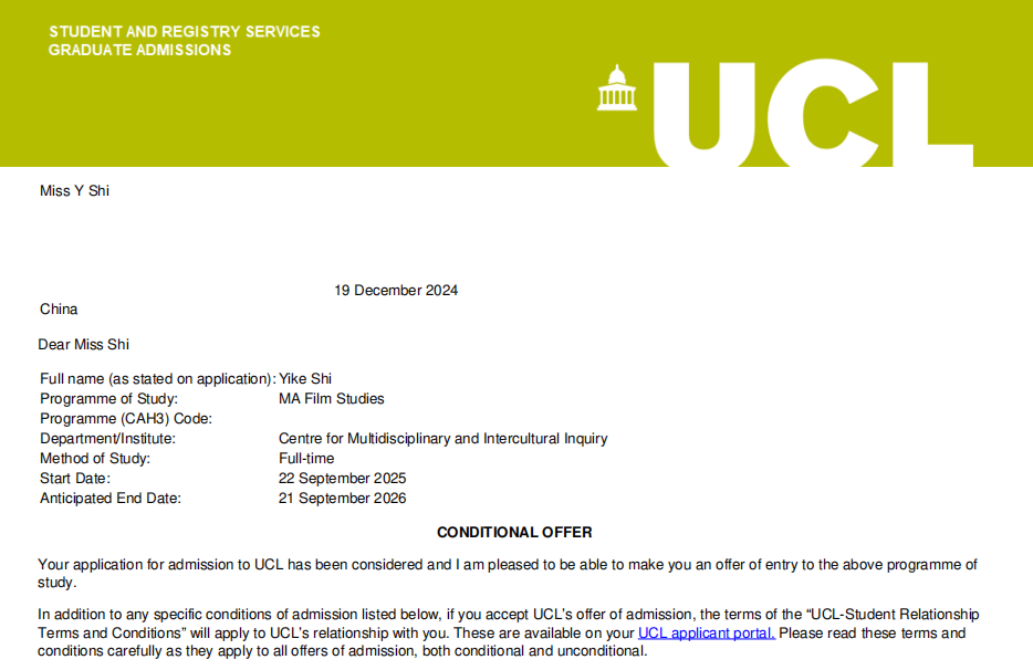 特别祝贺2025届人文与社会科学学院学子 史弋可同学,斩获伦敦大学学院(QS:9)OFFER。