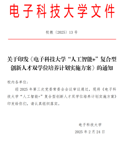 2025年2月,学校发布《电子科技大学“人工智能+”复合型创新人才双学位培养计划实施方案》以培养理论基础扎实、具备卓越实践能力和前瞻创新思维的人工智能领域复合型创新人才。