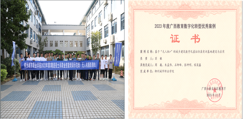 专业团队具有突出的社会服务能力,近三年内为全区退役军人提供了“无人机测绘”和“无人机摄影测量”等培训与考证服务,举办无人机社会培训与考证活动等。《基于“无人机+”的城乡建筑数字化虚拟仿真实训基地建设与应用》案例荣获2023年度广西教育数字化转型优秀案例,《“无人机+”助推退役军人高质量就业创业》案例荣获2024年广西全民数字素养与技能提升月优秀案例。