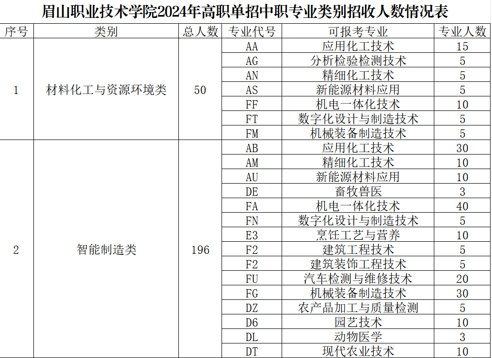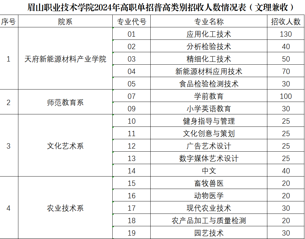 眉山职业技术学院2024年高职单招各类别招收人数情况表