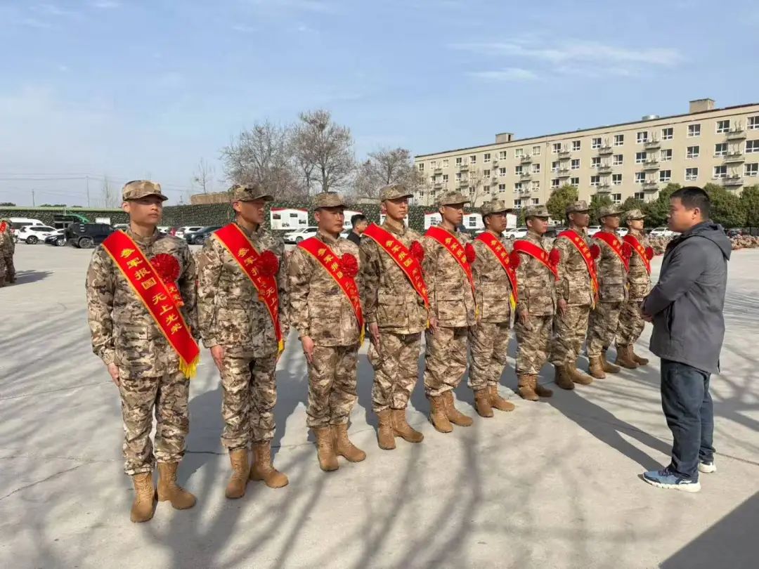 集训场地上旗帜猎猎作响,我校新兵身着崭新戎装,身姿挺拔,列队整齐,学工部王部长与学生亲切交谈,为他们佩戴“参军光荣”大红花并赠送纪念品。