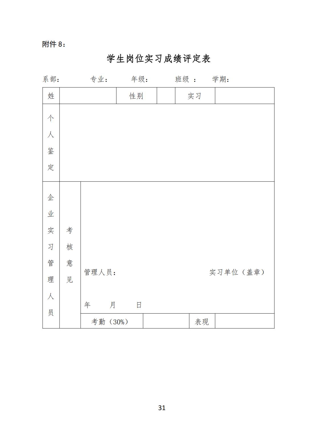 第三十二条企业对学生的考核。企业要对学生在每一部门或岗位的表现进行考核,填写《学生岗位实习成绩评定表》,并签字确认,加盖单位公章。