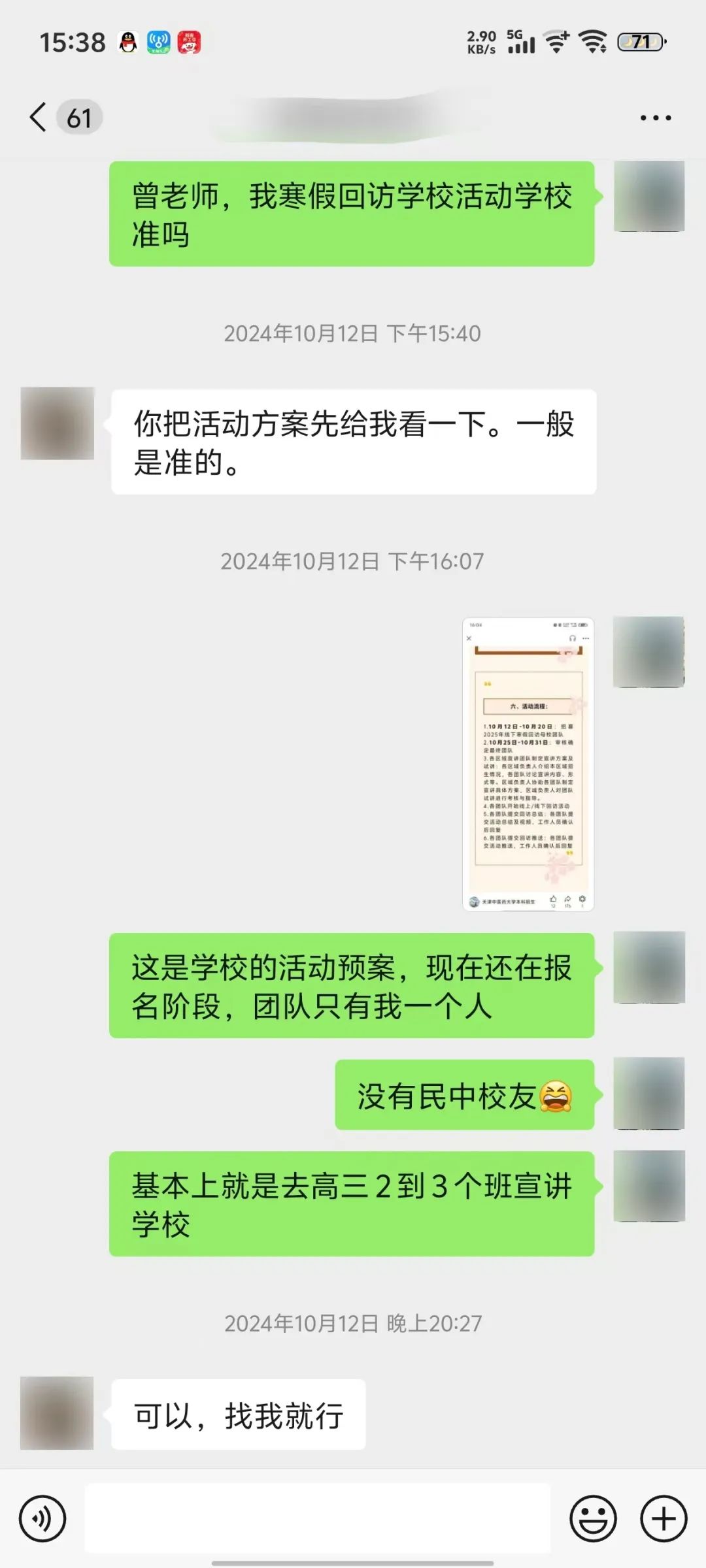 并与其它大学有意回访的高中校友确定具体时间一起行动,在宣传的同时减少对高三学弟学妹们时间的占用。