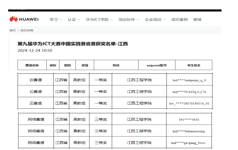 近日,第九届华为ICT大赛中国实践赛江西省赛圆满落幕,江西工程学院与南昌大学、江西师范大学等35所院校2668名学生参赛队伍同台竞技,历经层层选拔与激烈比拼,在学校领导和科技处大力支持下,江西工程学院人工智能与数据科学学院同学表现出色,荣获本科组云赛道省级一等奖3项、网络赛道三等奖3项。