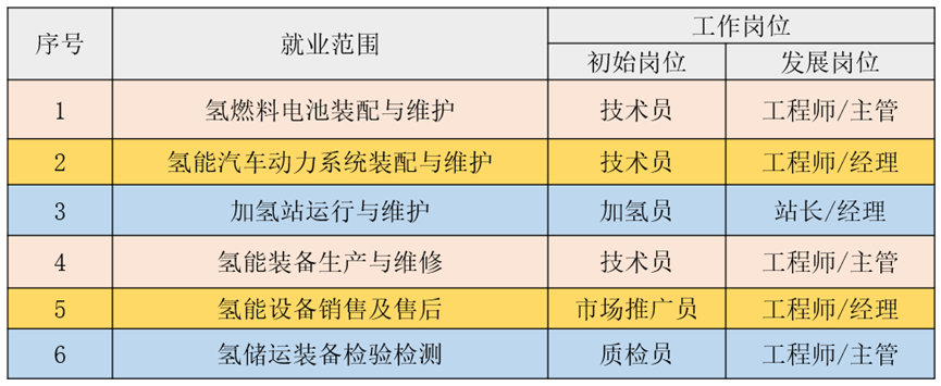学生毕业后能够在制氢设备生产企业、燃料电池生产企业、加氢站、氢能源汽车生产企业、氢气生产企业或政府部门等企业,从事氢气生产管理与检验、氢气储存与运输加注、氢燃料电池装配与检测维护、氢能汽车动力系统装配与检测维护、氢能系统运行安全监管、氢能设备生产及销售与售后服务等工作。