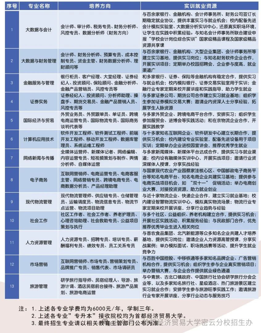 依托统一学籍管理体系,学校各专业优秀毕业生均可通过“专升本”渠道升入首都经济贸易大学本科层次深造(全日制第一学历)。