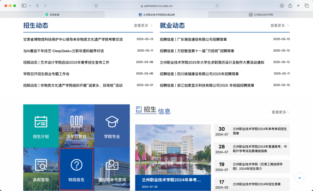 【电脑端】浏览器登陆兰州职业技术学院招生就业处官网,点击“转段报名”进入首页点击“我要报名”进行信息填写。