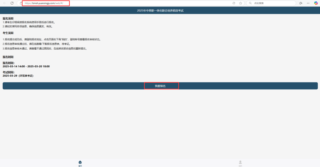 【电脑端】浏览器中输入“https://bmsh.yuanxingjy.com/web/”,进入首页点击“我要报名”进行信息填写。