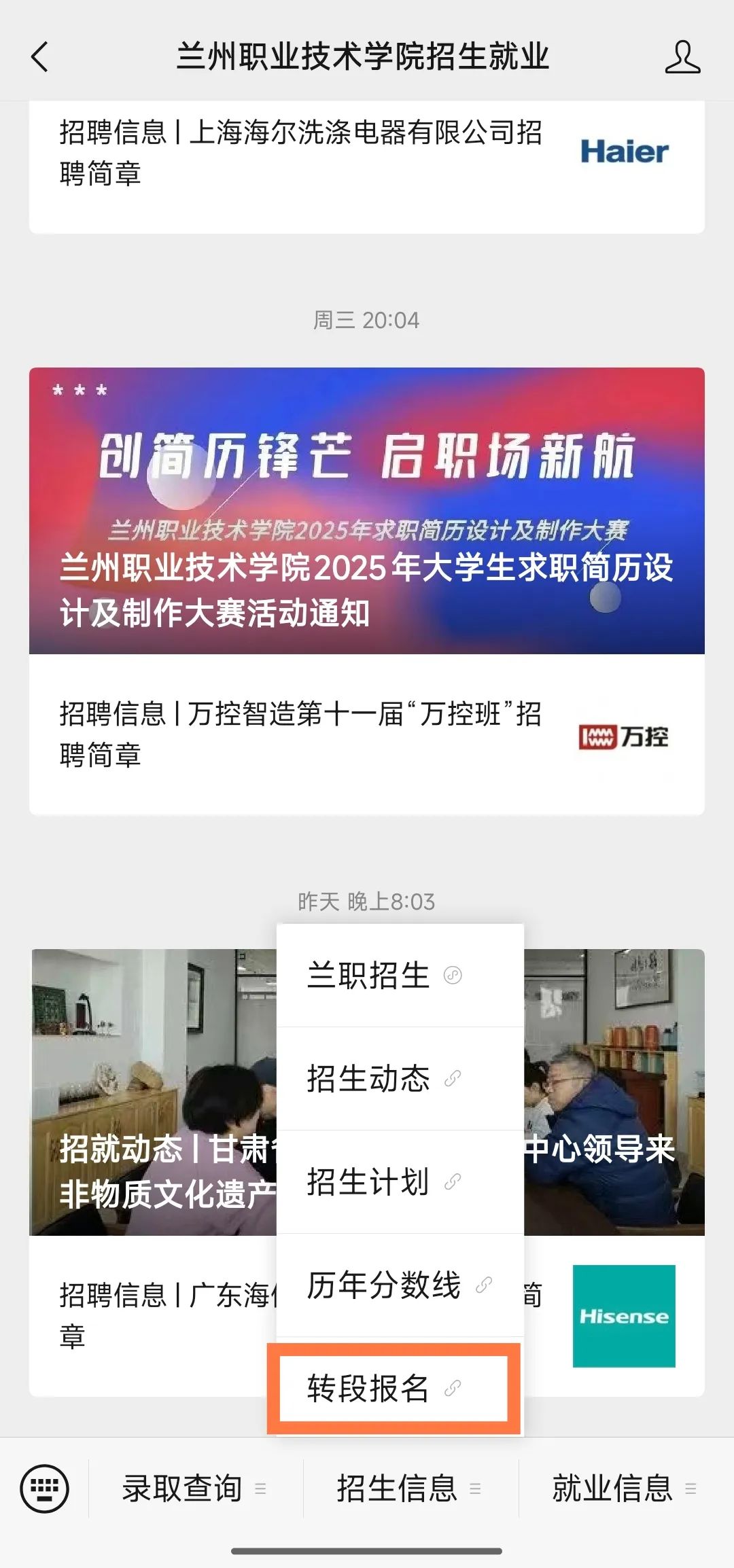 【手机端】在微信中搜索并关注“兰州职业技术学院招生就业”公众号,点击底部菜单栏“招生信息”点击“转段报名”进入首页点击“我要报名”进行信息填写。