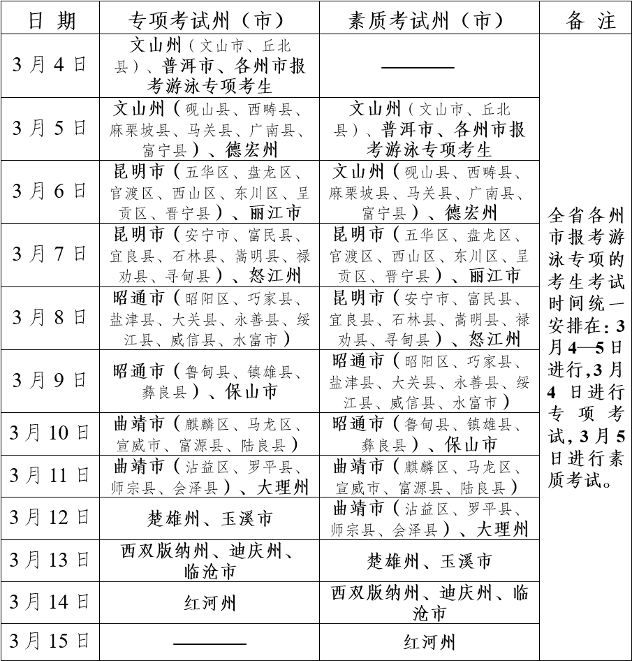 2025年3月4—15日(共12天),各州市具体日程安排详见下表。其中,全省各州市报考游泳专项的考生考试时间统一安排在3月4—5日进行,3月4日进行专项考试,3月5日进行素质考试。如遇不可抗拒因素考试无法正常进行时,考试时间依次顺延。