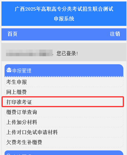 二、下载打印准考证登入申报系统,选择“申报管理→打印准考证”