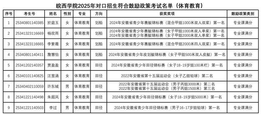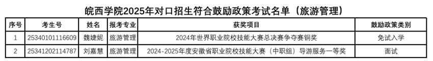 根据《安徽省教育厅关于印发2025年安徽省应用型本科高校面向中职毕业生对口考试和招生工作实施方案的通知》和《皖西学院2025年面向中职毕业生对口招生章程》规定,经考生本人申请、学校审核,共有以下11名考生符合对口招生考试鼓励政策要求,名单公示如下: