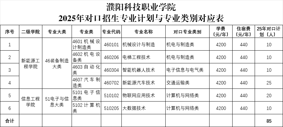 濮阳科技职业学院2025年对口招生专业计划与专业类别对应表