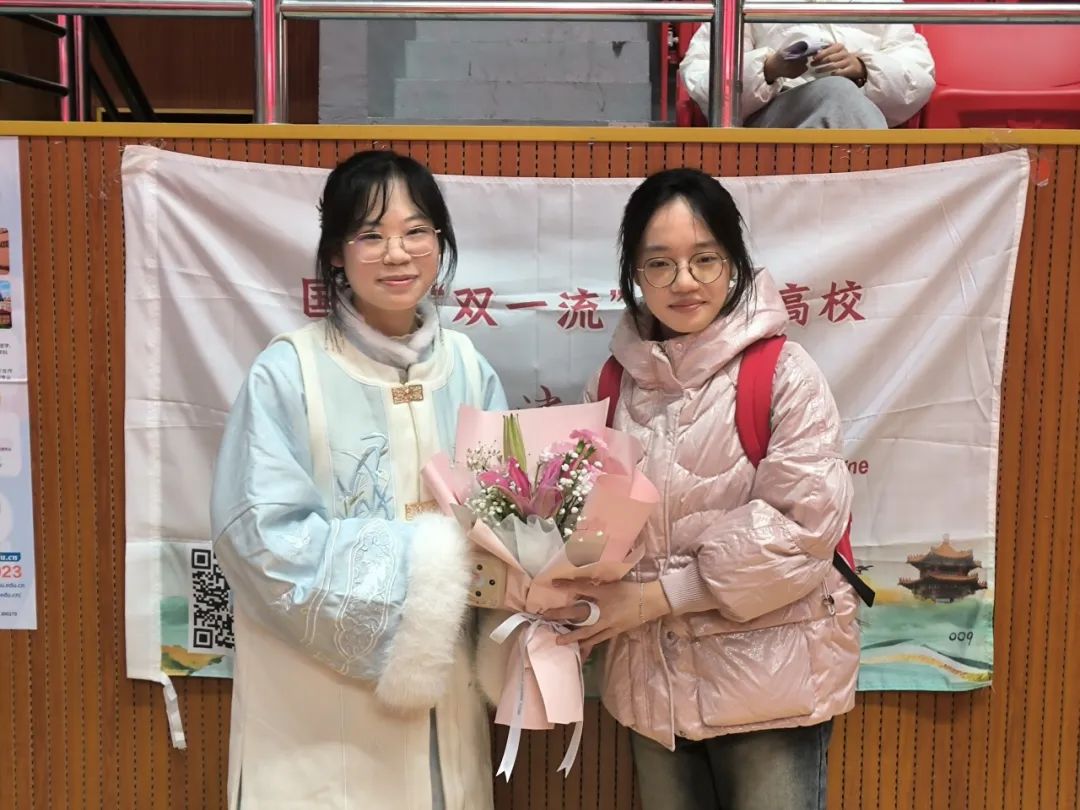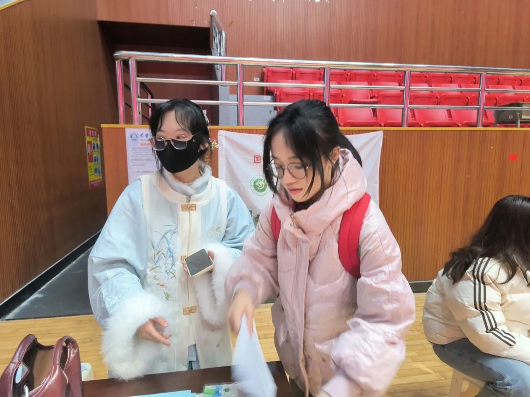 王思迈和许伊同学为大家介绍了我们学校的发展历程,校园环境并发放了相应的宣传手册及学校为大家提前准备的物料。同学们的反响都很积极热烈,同时展现出了对中医药文化极大的兴趣,于是我们与一些有兴趣的学弟学妹们进入了更深入的交流探讨并交换了联系方式。