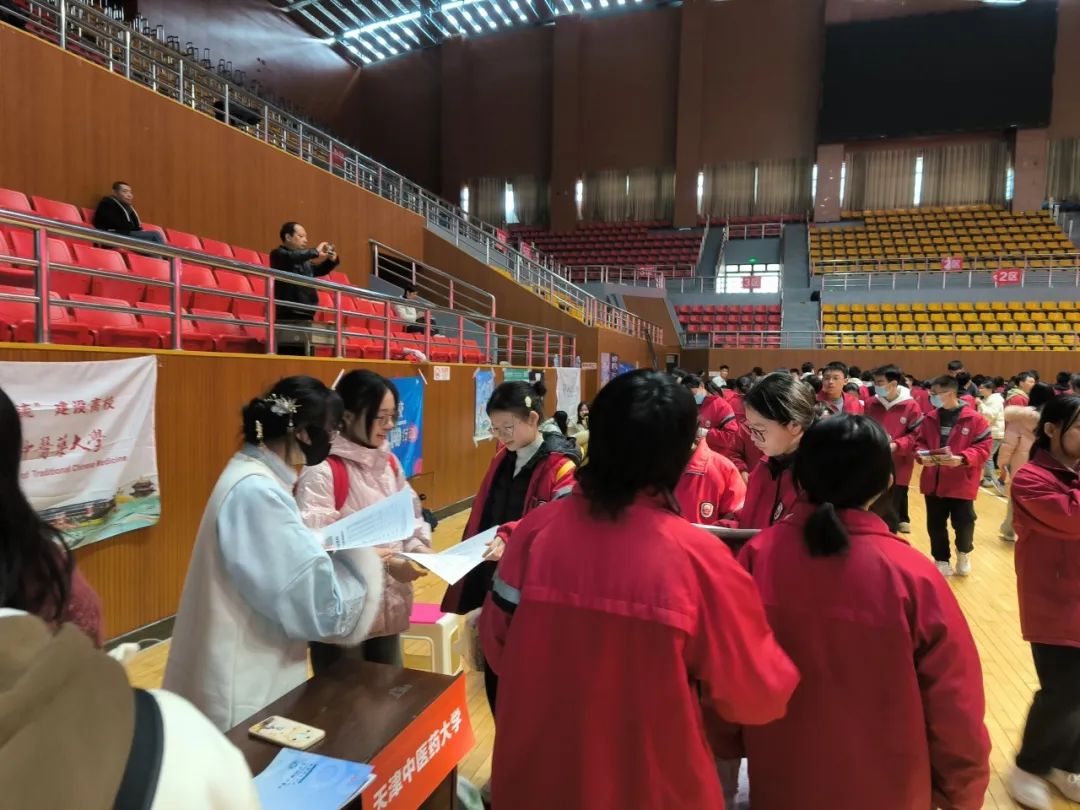 宣传的同学分发了学校招生办提供的宣传单和往届各专业录取分数统计等资料详细;讲解了学校的专业特色,尤其是中医学、中药学、针灸推拿学、中西医临床医学等国家级一流本科专业;为同学们介绍天津中医药大学几大特色专业的分数线、排名情况、选考科目限制以及就业前景等信息,还着重分享勇博班、中药学拔尖学生培养基地班等学校特色教学模式,根据学弟学妹们的兴趣方向,提供有针对性的建议为前来咨询的学弟学妹们送出由学校招生办提供的精美文创。