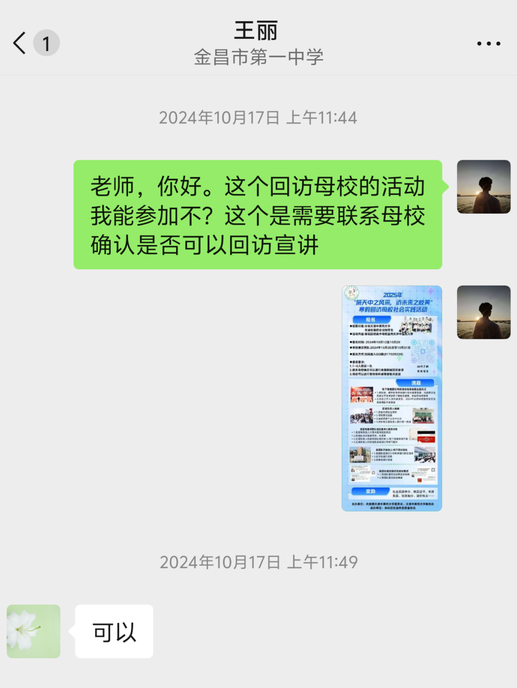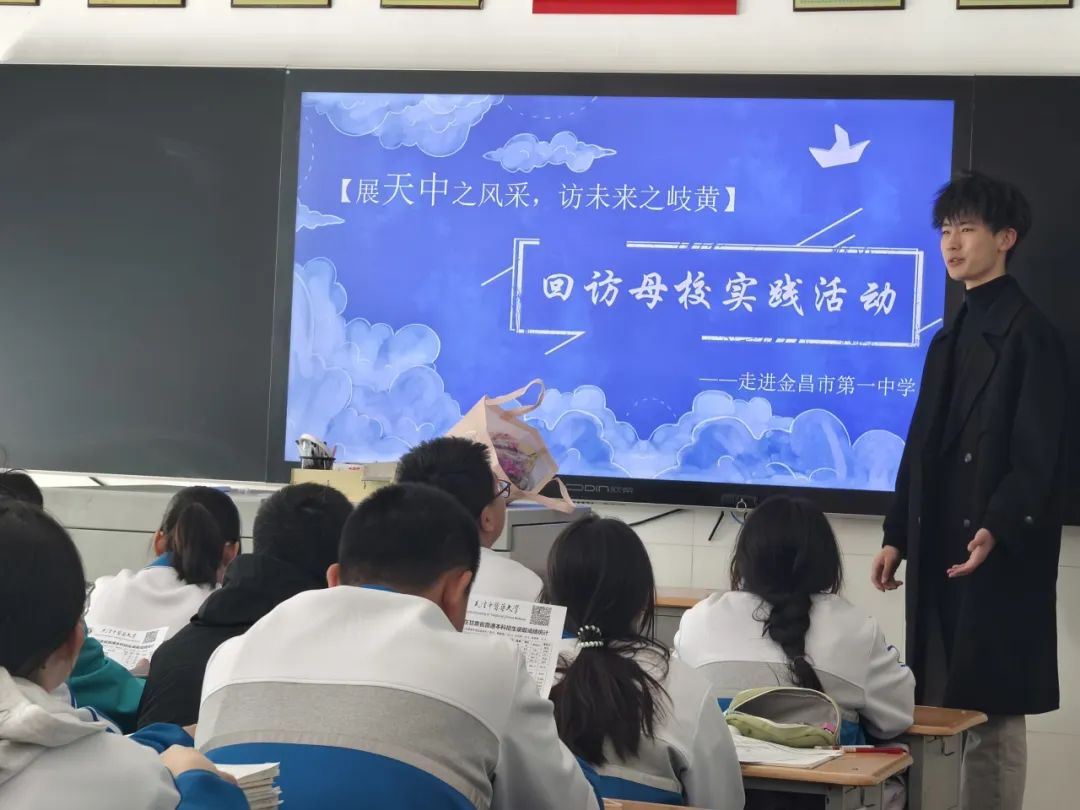 来源 | 甘肃省金昌市第一中学回访团队 2025年回访高中母校活动往期回顾01.走进甘肃省兰州市第一中学02.走进天津市宝坻区第四中学03.走进天津市宁河区潘庄中学04.走进天津市第一中学滨海学校05.走进华东师范大学盐城高级中学06.走进甘肃省天水市第一中学07.走进河南省嵩县第一高级中学08.走进广东省揭阳市第一中学09.走进甘肃省渭源县第一中学10.走进广东省东莞市实验中学11.走进河南省安阳市内黄县第一中学12.走进吉林省白山市抚松县第一中学13.走进山西省平遥中学14.走进河北省内丘中学15.走进天津市第二南开中学16.走进内蒙古呼和浩特市第一中学17.走进四川省达州市耀华中学18.走进广西玉林高级中学19.走进广西梧州高级中学20.走进山西省晋城市第二中学21.走进河北省承德县第一中学22.走进天津市天和城实验中学23.走进河北省冀州中学24.走进安徽省芜湖市第一中学25.走进安徽省蚌埠市第二中学26.走进河北省石家庄第二实验中学27.走进山西师范大学实验中学28.走进云南省昭通市昭阳区第一中学29.走进河北省玉田县第一中学30.走进山西省灵石县第一中学31.走进山西省长治学院附属太行中学32.走进山西省太原市第四十八中学33.走进内蒙古巴彦淖尔市第一中学34.走进内蒙古鄂尔多斯市一中35.走进山西省寿阳县第一中学36.走进河北省沧州市第一中学37.走进天津市咸水沽第一中学38.走进河南省焦作市温县第一高级中学39.走进河南省清丰县第一高级中学40.走进河南省开封高级中学41.走进天津市静海区第一中学42.走进天津市宝坻区第一中学43.走进天津市第四十二中学44.走进天津市杨柳青第一中学45.走进天津市新华中学46.走进甘肃省白银市会宁县第四中学47.走进甘肃省张掖市第二中学48.走进河北省衡水市第二中学49.走进河北省武邑宏达学校50.走进河北省清河县志臻中学51.走进河北省定州市李亲顾中学52.走进新疆乌鲁木齐市第101中学53.走进广西桂林市第十八中学