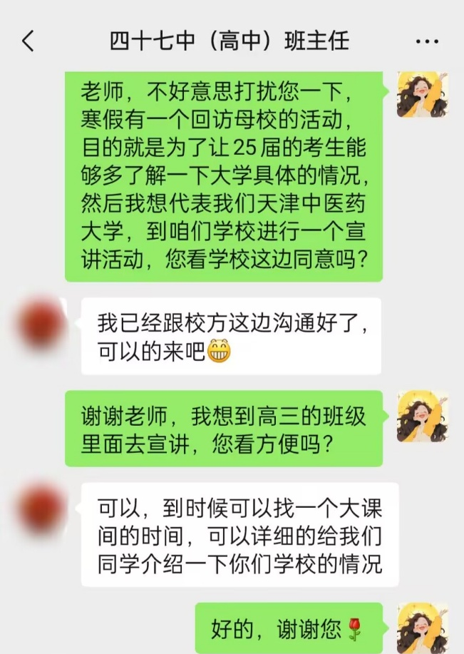 4、制定回访计划和目标:根据高三学生作息和学校日程安排,确定具体时间地点进行回访,策划活动流程并制定宣讲方案,通过此次回访母校活动,加强母校学子对天津中医药大学的了解