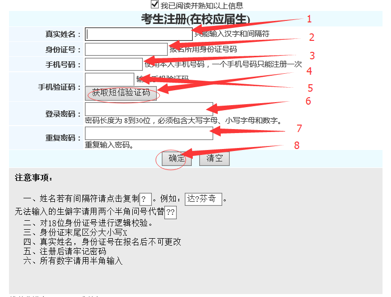 注意:每个手机号码、身份证号只能注册一次,请考生保护好自己个人信息,以免被他人恶意注册。