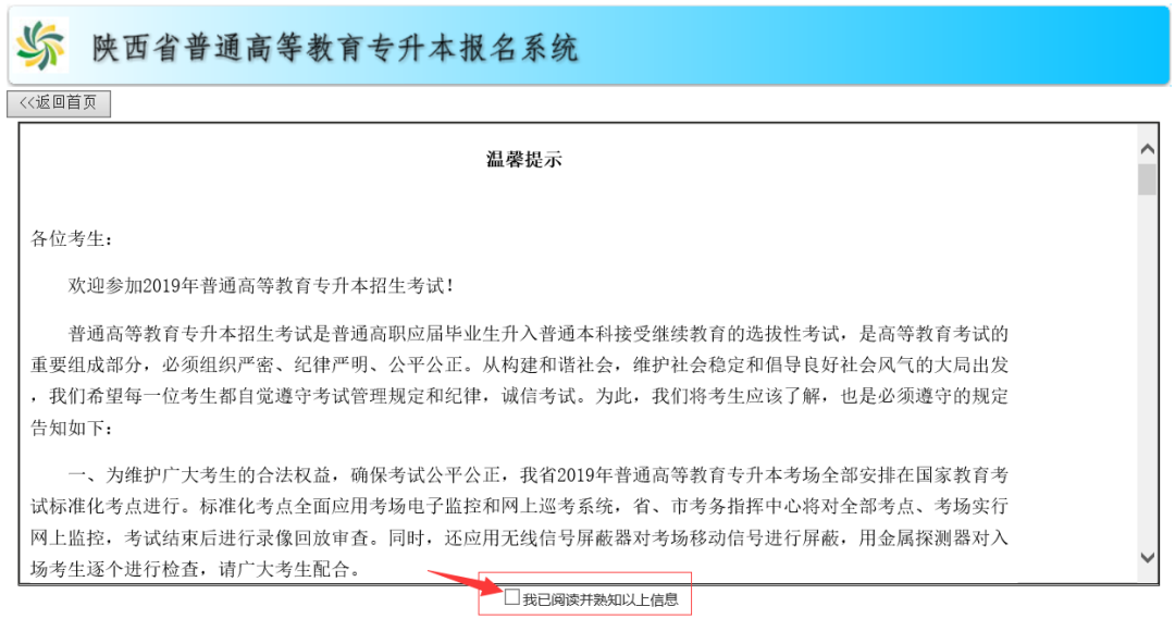 阅读完毕后点击“我已阅读并熟知以上信息”前的选择框。