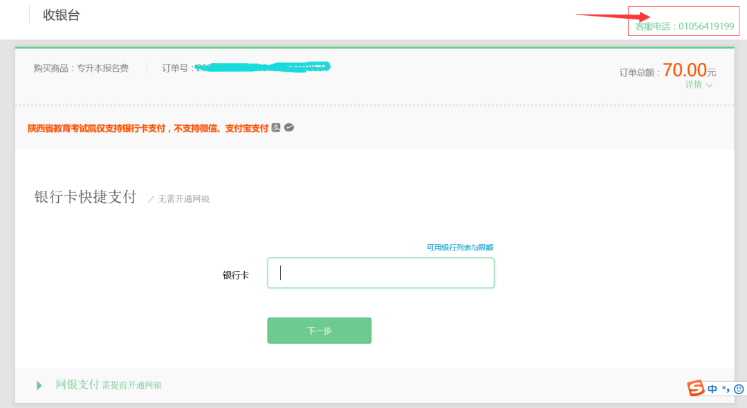 点击“支付”按钮,进入易宝支付收银台(按照系统提示完成网上支付,支付过程中遇到问题可咨询易宝支付客服电话)。
