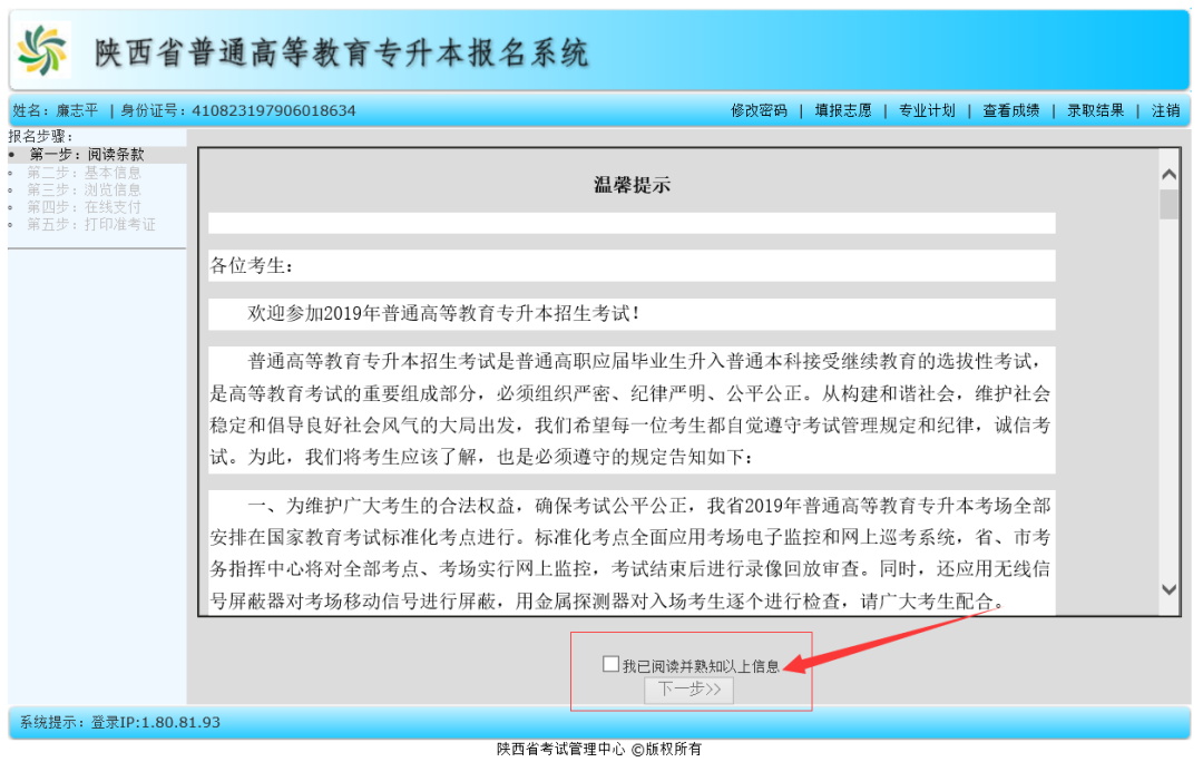 认真阅读“考生须知”、“考生注意事项”、“考场规则”、“国家教育考试违规处理办法(节录)”、“《中华人民共和国刑法修正案(九)》节录”等信息,勾选“我已阅读并熟知以上信息”前的选择框,并点击“下一步按钮”进入填写信息页面。