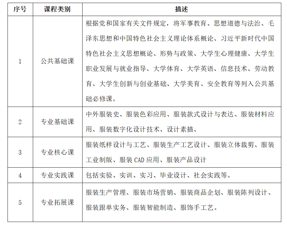 培养目标:培养掌握本专业知识和技术技能,具备职业综合素质和行动能力,面向纺织服装行业的服装制版、服装设计、服装智造、服装生产管理等岗位群,培养能够从事服装产品设计、样板设计、服装工艺设计、服装智能生产管理、服装营销与跟单等工作的高素质技术技能人才。