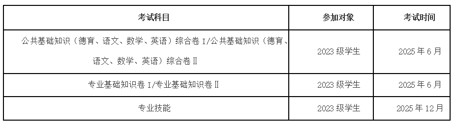 公共基础知识考试(德育、语文、数学、英语)、专业基础知识考试安排在二年级下学期,专业技能考试安排在三年级上学期。