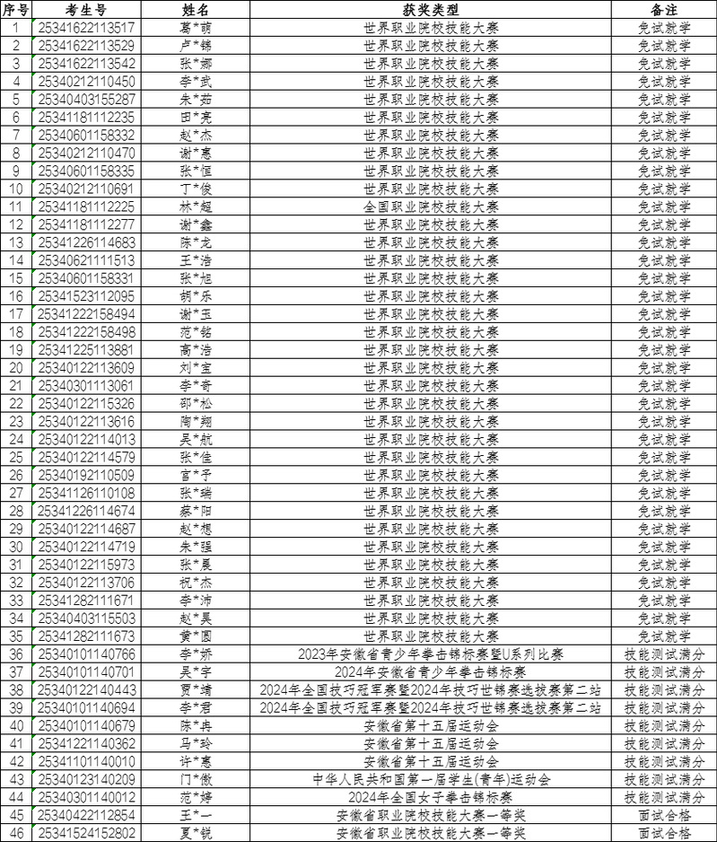 根据《安徽省教育厅关于印发2025年安徽省应用型本科高校面向中职毕业生对口考试和招生工作实施方案的通知》(皖教秘职成〔2024〕88号)、《淮南师范学院2025年面向中职毕业生对口招生章程》等文件相关鼓励政策规定,经考生本人申请,我校对口招生工作组审核,共有以下考生符合省教育厅下发鼓励政策名单及我校对口招生考试相关鼓励政策,现予以公示。