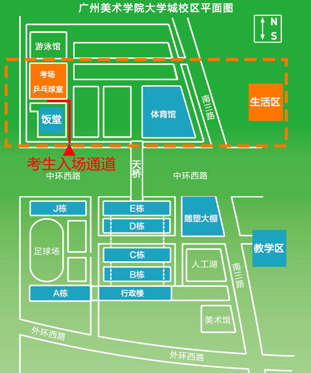 考点位于广东省广州市番禺区大学城中环西路广州美术学院生活区。考试前,学校考场不开放提前进校查看,请考生尽量提前1小时到达考点,所有考生务必从大学城中环西路广州美术学院生活区6号门岗(导航:广东省广州市番禺区大学城中环西路广州美术学院生活区饭堂)进校,考生须按照考点要求依次排队进入考场区域。
