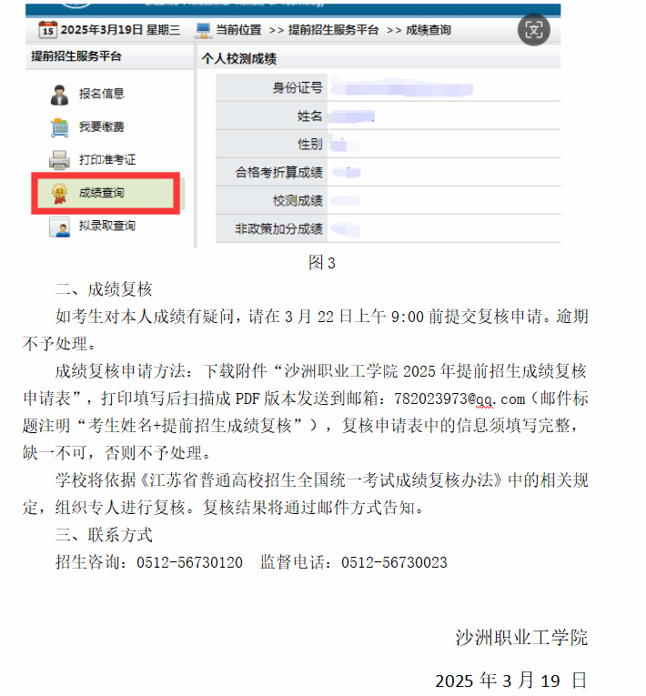 沙洲职业工学院2025年提前招生第一轮成绩查询及复核须知