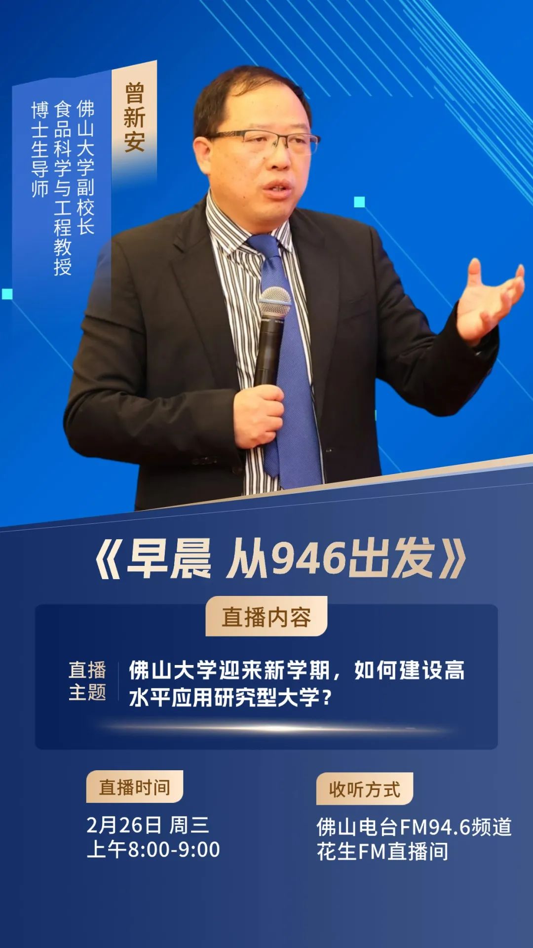 新学期,新起点,佛山大学正迎来新的发展阶段。2月26日(周三)上午8:00-9:00我校副校长曾新安教授、发规部部长陈东初教授将做客佛山电台FM94.6频道《早晨从946出发》节目,围绕“佛山大学如何推进高水平应用研究型大学建设”的话题,与大家进行深入交流和互动,敬请期待!