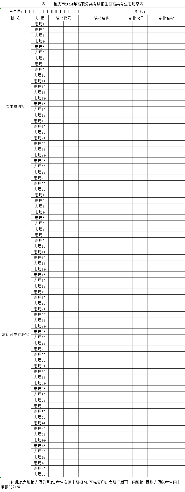 (一)重庆市2024年高职分类考试招生普高类考生志愿草表可填报考生:所有普高类考生(样表见表一)