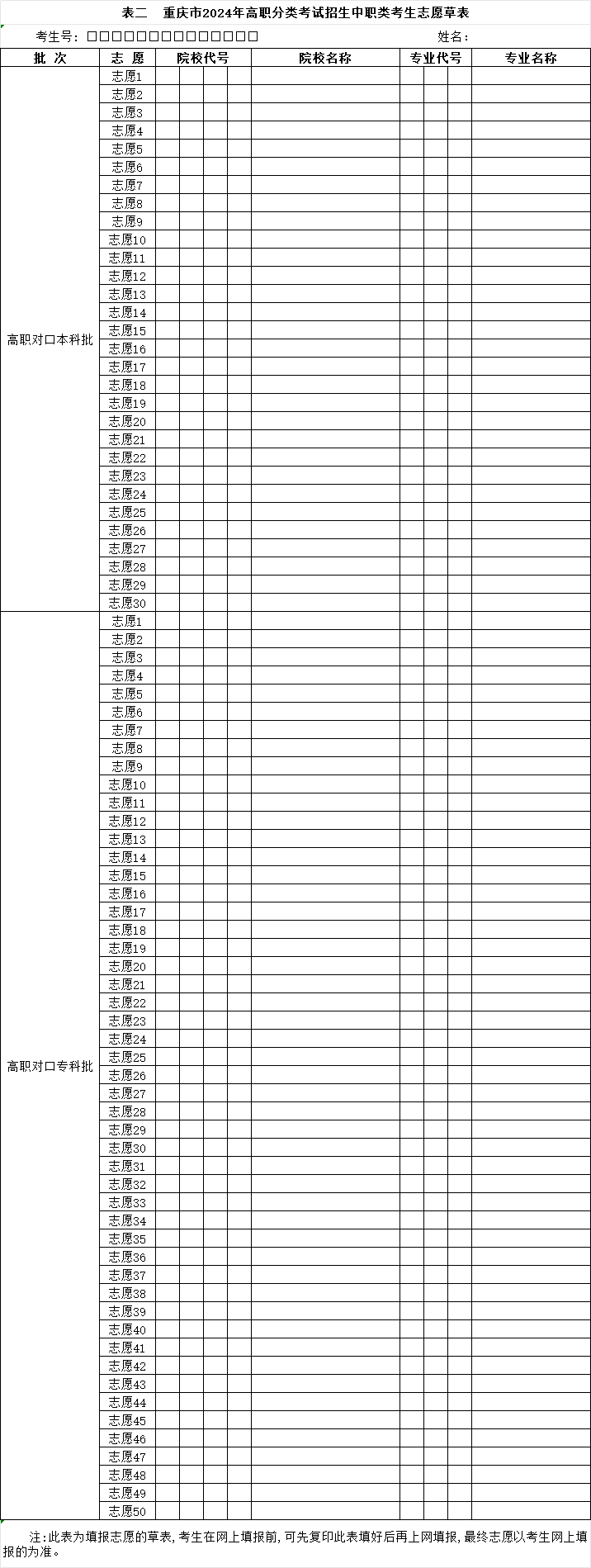 (二)重庆市2024 年高职分类考试招生中职类考生志愿草表可填报考生:除其他类的所有高职对口类考生(样表见表二)