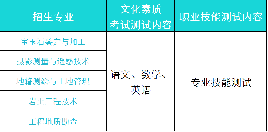 此次高职单招招生考试采取“文化素质+职业技能测试”的模式,考试时间3月30日(其中文化素质测试时间9:00开始,职业技能测试时间14:00开始,具体时间以准考证为准)。各专业考试方式具体见下表。