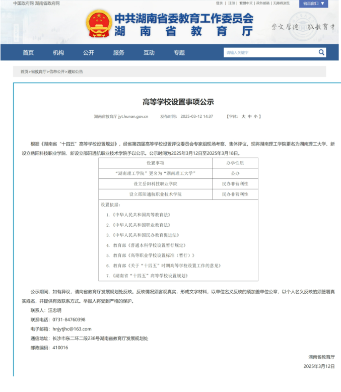 3月12日,湖南省教育厅发布《高等学校设置事项公示》:根据《湖南省“十四五”高等学校设置规划》,经省第四届高等学校设置评议委员会专家组现场考察、集体评议,现将