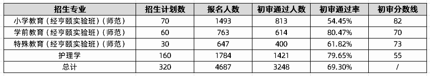 再看看各专业的初审通过率,学前教育(经亨颐实验班)(师范)专业以80.47%的通过率位居榜首,而小学教育(经亨颐实验班)(师范)专业尽管报名人数众多,但初审通过率仅为 54.45%,相对其他专业略低。这清晰地展现出不同专业的竞争程度存在明显差异。