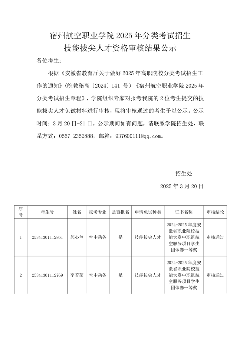 宿州航空职业学院 2025 年分类考试招生技能拔尖人才资格审核结果公示