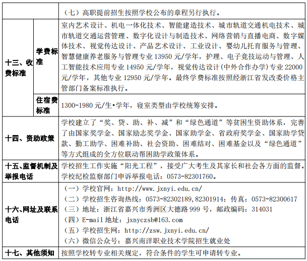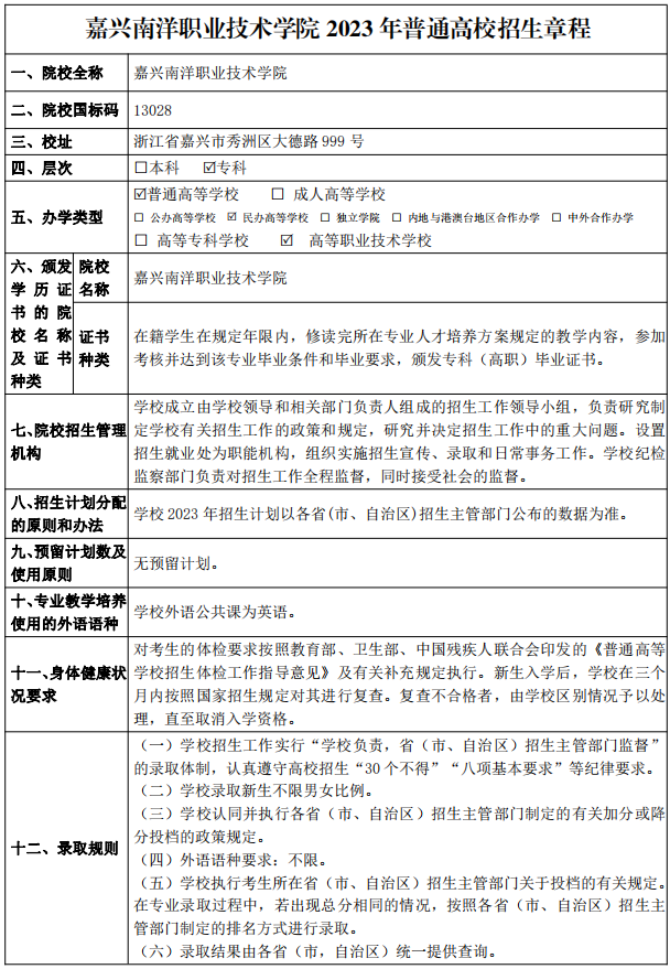 嘉兴南洋职业技术学院2023年普通高校招生章程