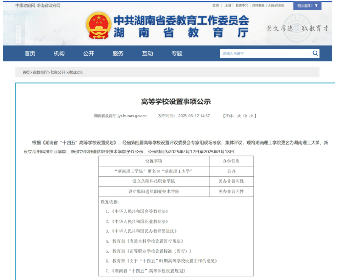 3月12日,湖南省教育厅发布《高等学校设置事项公示》湖南理工学院更名为湖南理工大学。