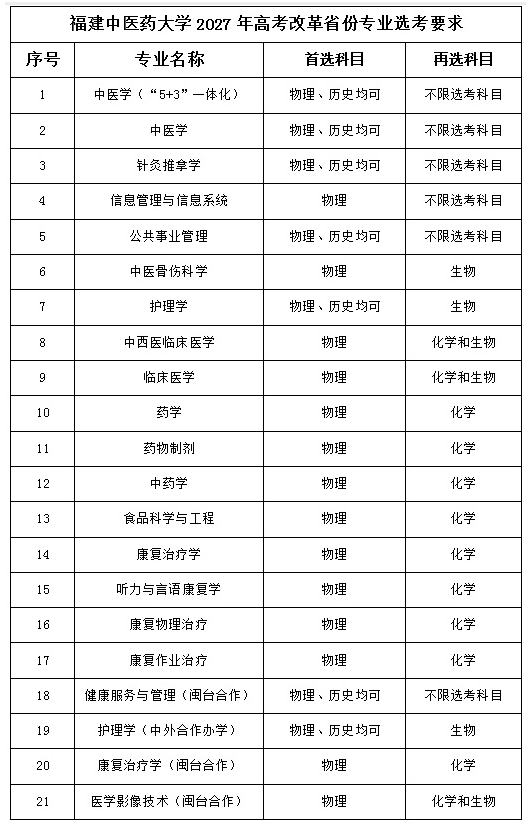为便于大家查询福建中医药大学2027年高考改革省份本科招生专业选考科目及其要求,现将相关信息汇总如下: