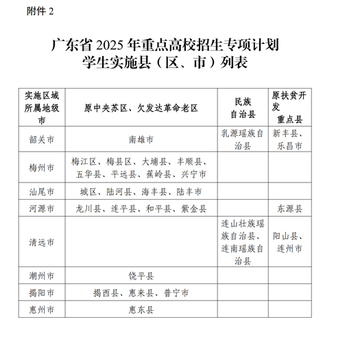 (二)实施区域。我省2025年实施专项计划的范围为原中央苏区、欠发达革命老区、少数民族自治县及我省原扶贫开发重点县,实施范围共30个县(市、区)(附件2)。