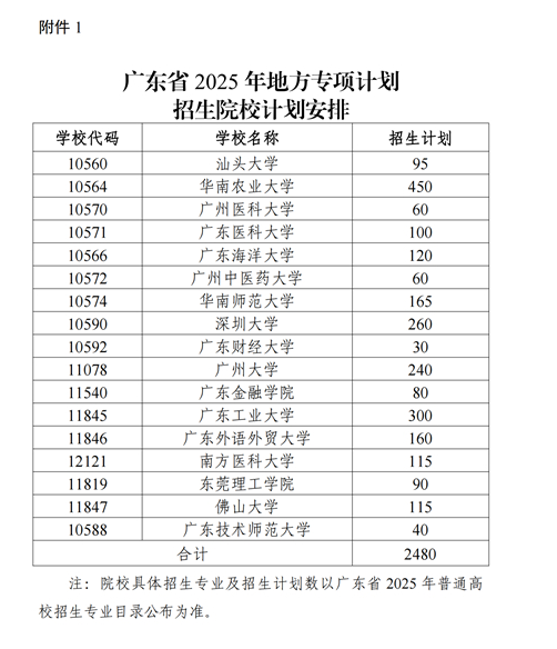 1.广东省2025年地方专项计划招生院校计划安排