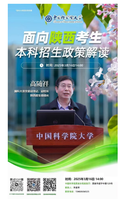 为进一步做好中国科学院大学本科招生宣传工作,及时解答广大考生及家长关心的中国科学院大学在陕本科招生情况、本科生培养方案及综合评价的有关政策,定于3月16日下午在中国科学院西安分院召开中国科学院大学招生宣讲会。