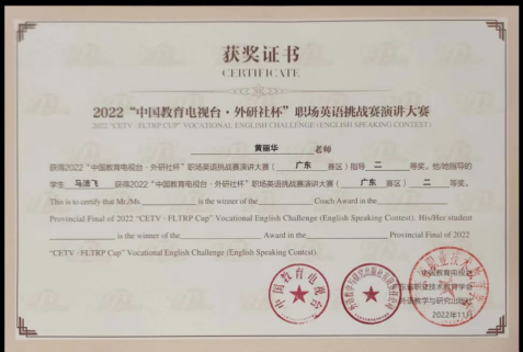 2022.11马洁飞获得2022年外研社杯职场英语挑战赛(演讲大赛)二等奖。