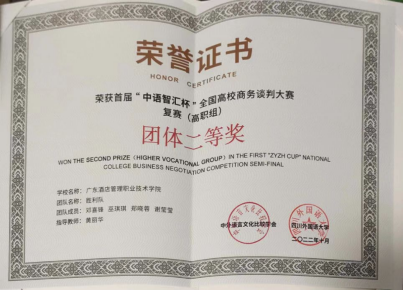 2022.10邓喜锋、巫琪琪、郑晓蓉、谢莹莹获得2022年首届“中语智汇杯”商务谈判大赛(省部级)二等奖。