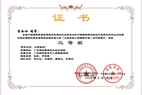 2023.06李如仙,吕燕婷,廖婧如,许翠芬获得第四届全国高校商业精英挑战赛会展文案(大型活动人群管理方案)创作竞赛(国家级竞赛)三等奖。