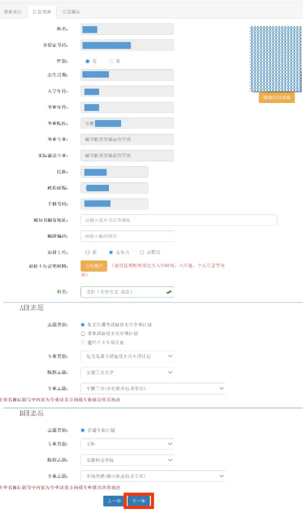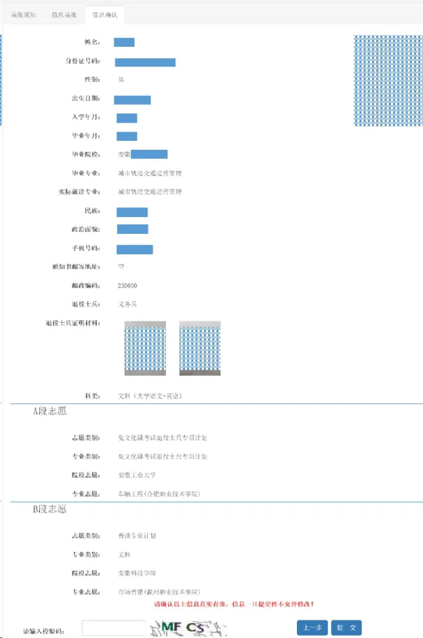 采像完成后,待PC端界面中出现照片,则表示信息采集已经完成,出现类似以下界面,请仔细检查所填(选)的项目,确认无误后,点击“下一步”进入提交页面。